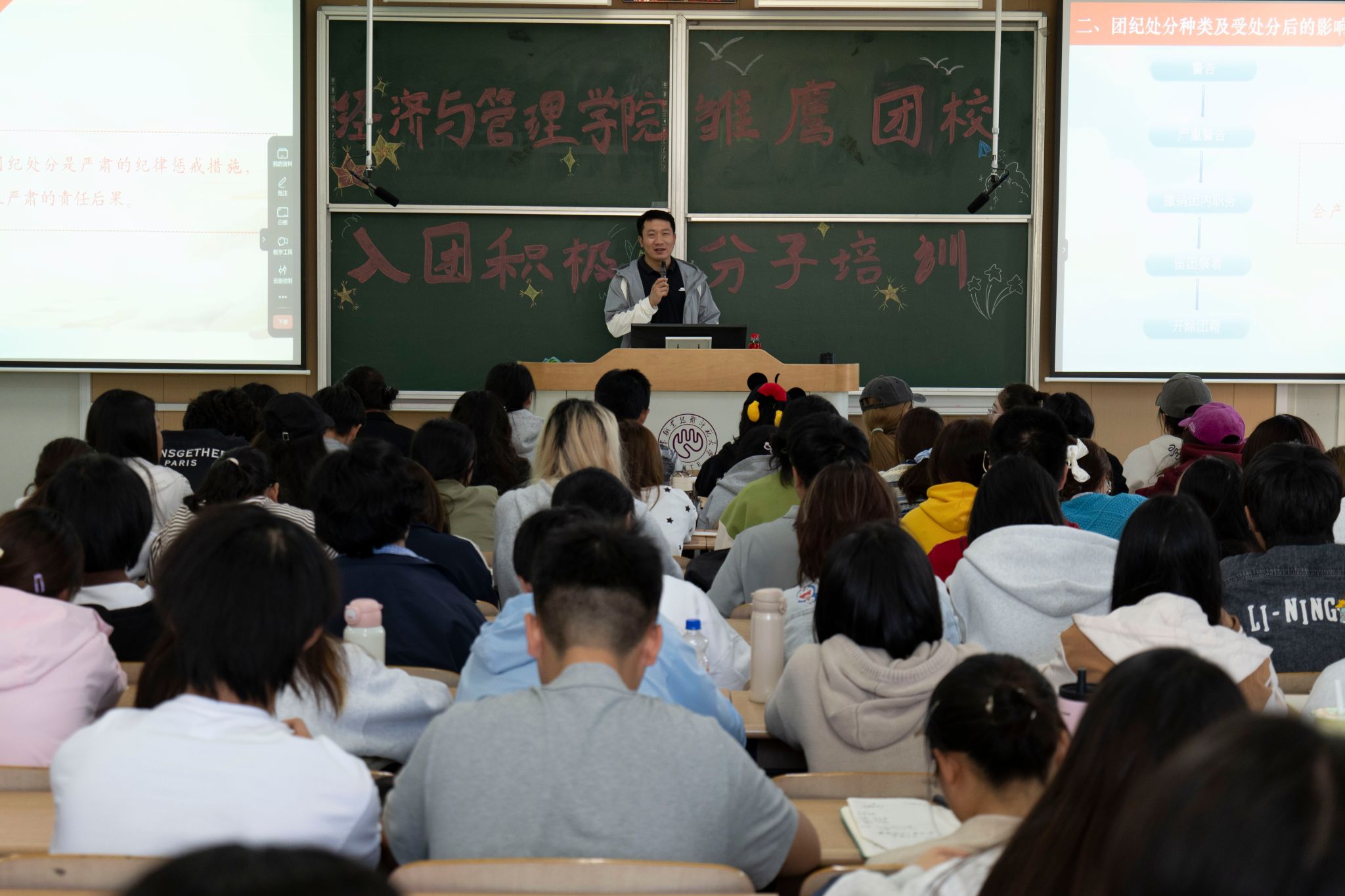在第三教学楼开展“雏鹰团校”入团积极分子系列培训。学院团委书记闫丹、马克思主义学院教师武培培、辅导员殷天皓、优秀共青团员代表李春滔、优秀学生干部代表蒋明霖为130余名入团积极分子展开培训。