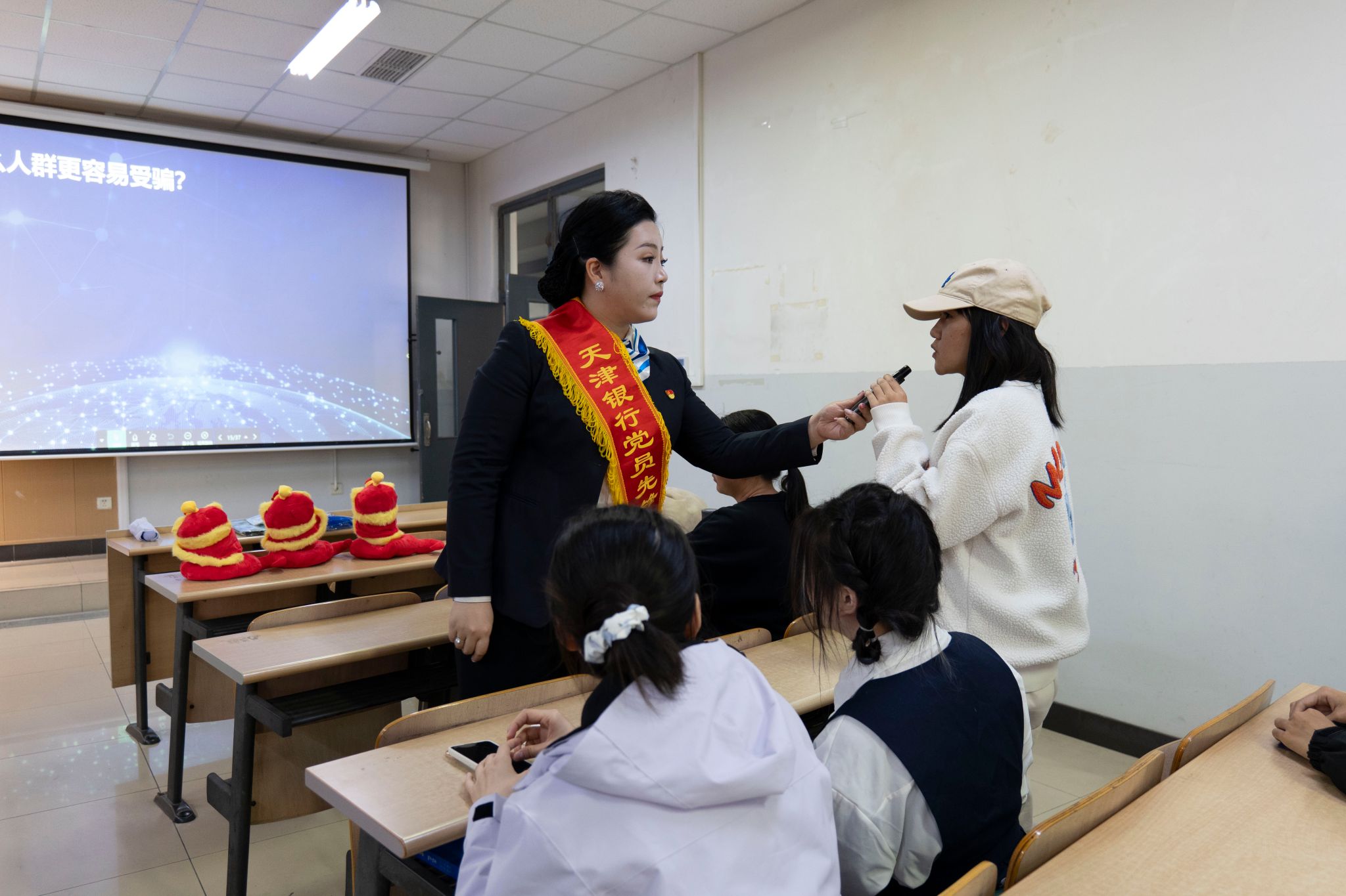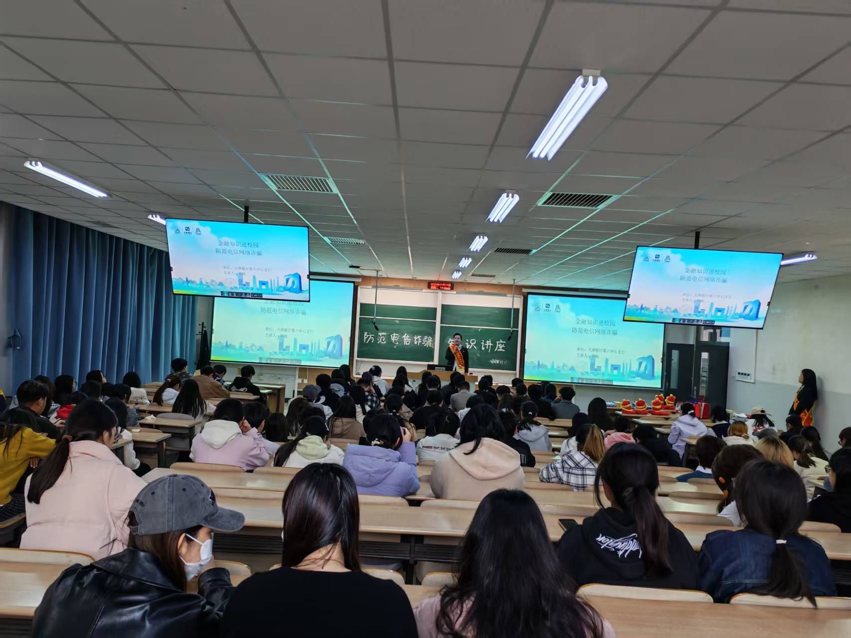 在第二教学楼 208 教室举办防范电信诈骗知识讲座。学院邀请天津银行金融知识普及专员、反假币宣传专员谢地担任主讲人,学院学工办主任、团委书记闫丹和 200 名学生现场参加。