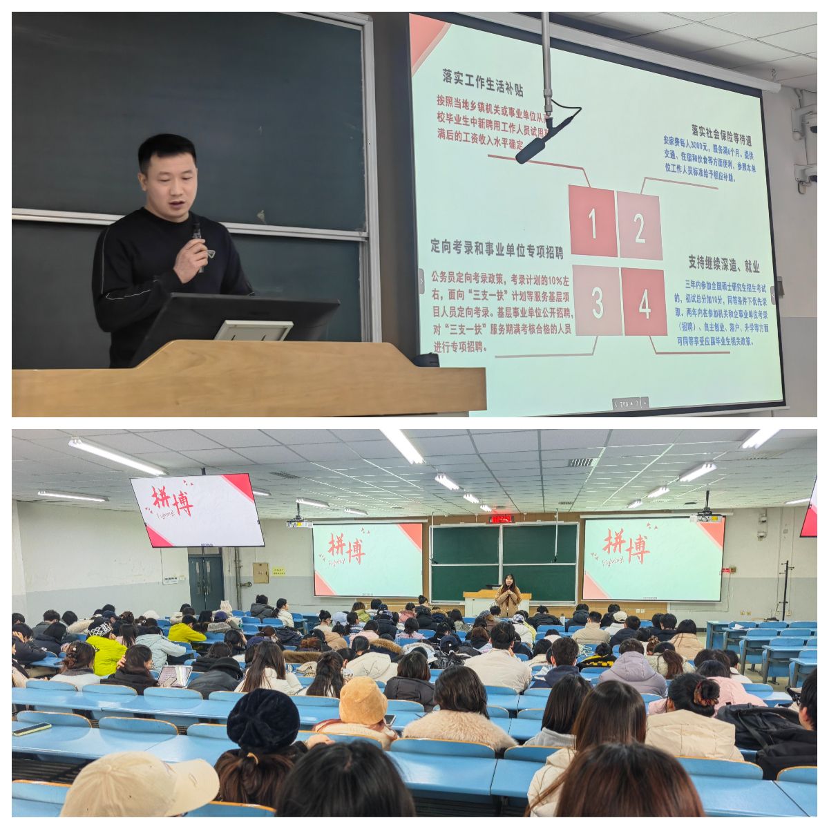 辅导员殷天皓向毕业生们介绍了学院近3年来的就业情况,包括就业去向分布、主要就业单位类型等,重点宣讲了基层就业政策,包括“三支一扶”、西部计划、“特岗教师”等项目流程、优惠政策和发展前景,鼓励毕业生积极投身基层、服务基层,在基层岗位上实现自身价值。此外,他还对就业分类进行了详细解读,帮助毕业生明确不同就业方向的要求和准备重点。