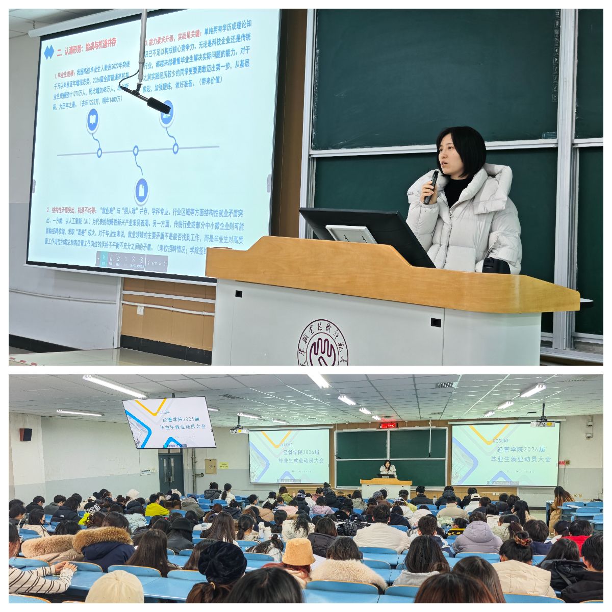 在第二教学楼402教室召开2026届毕业生就业动员大会。学院党委书记刘晶、党委副书记郭丽芳、毕业班辅导员及全体2026届毕业生参会。