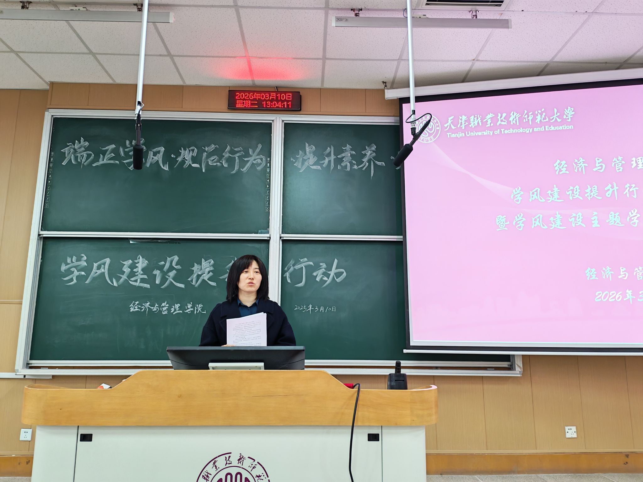 会上,院学工办主任、团委书记闫丹首先介绍了学风建设提升行动的整体安排,明确了本次行动的核心目标与工作重点,本次学风建设提升行动面向全院学生开展,将通过召开主题班会、开展学习习惯打卡、举办优秀学习笔记展示大赛、强化考勤抽查、发布学风倡议书、开设考研自习室等一系列举措,多维度、全方位加强学风建设,规范学生学习行为,提升学生学习素养。辅导员郭亚心详细解读了本次行动的核心特色活动,强调了学生骨干在学风建设中的重要作用,鼓励学生骨干带头参与,做好班级、社团的宣传与组织工作,带动全院同学积极投身学风建设。随后,2025年校级“优良学风”班财会2301班、信管2401班代表依次上台,分享了班级学风建设的特色经验与实践做法,为各班级打造专属学风亮点提供了有益借鉴。
